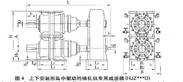 鑄軋機(jī)軋輥驅(qū)動(dòng)專用減速器按安裝形式有兩種類型。即:機(jī)座安裝型(見圖1、圖2)和上下安裝型(見圖3、圖4)。鑄軋機(jī)軋輥驅(qū)動(dòng)專用減速器按驅(qū)動(dòng)形式有兩種類型。即由多臺(tái)電機(jī)驅(qū)動(dòng)的單獨(dú)驅(qū)動(dòng)形式(不帶分流箱,見圖1、圖3)和一臺(tái)電機(jī)驅(qū)動(dòng)的集中驅(qū)動(dòng)形式(帶分流箱見圖2、圖4)。鑄軋機(jī)專用減速器的單獨(dú)驅(qū)動(dòng)形式傳動(dòng)裝置簡(jiǎn)單.軋輥輥速用電器裝置控制,可用于不同輥徑、不同輥速的鑄軋機(jī).,集中驅(qū)動(dòng)形式的傳動(dòng)裝置比單獨(dú)驅(qū)動(dòng)形式多了分流箱,用它代替了單獨(dú)驅(qū)動(dòng)形式的電器控制裝置。從經(jīng)濟(jì)指標(biāo)考慮,優(yōu)先推薦單獨(dú)驅(qū)動(dòng)形式的傳動(dòng)裝置。鑄軋機(jī)專用減速器的單獨(dú)驅(qū)動(dòng)形式和集中驅(qū)動(dòng)形式適用于任何鑄軋機(jī)的軋制工作狀態(tài)。對(duì)于軋輥在工作中處于磨損狀態(tài)的鑄軋機(jī),單獨(dú)驅(qū)動(dòng)形式的鑄軋機(jī)專用減速器可通過對(duì)電機(jī)轉(zhuǎn)速的調(diào)節(jié)來保證軋輥輥速相同,從而保證軋制工件的表面質(zhì)量。單獨(dú)驅(qū)動(dòng)形式不僅能用于相同直徑的軋輥,還可用于不同直徑(不僅是直徑的磨損)的軋輥。集中驅(qū)動(dòng)形式僅適用于軋輥直徑相同的鑄軋機(jī),當(dāng)產(chǎn)品表面質(zhì)量要求較高時(shí)只能通過修正輥徑來保證軋輥輥速。