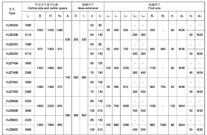 鑄軋機(jī)專用減速器外形安裝尺寸見表2.